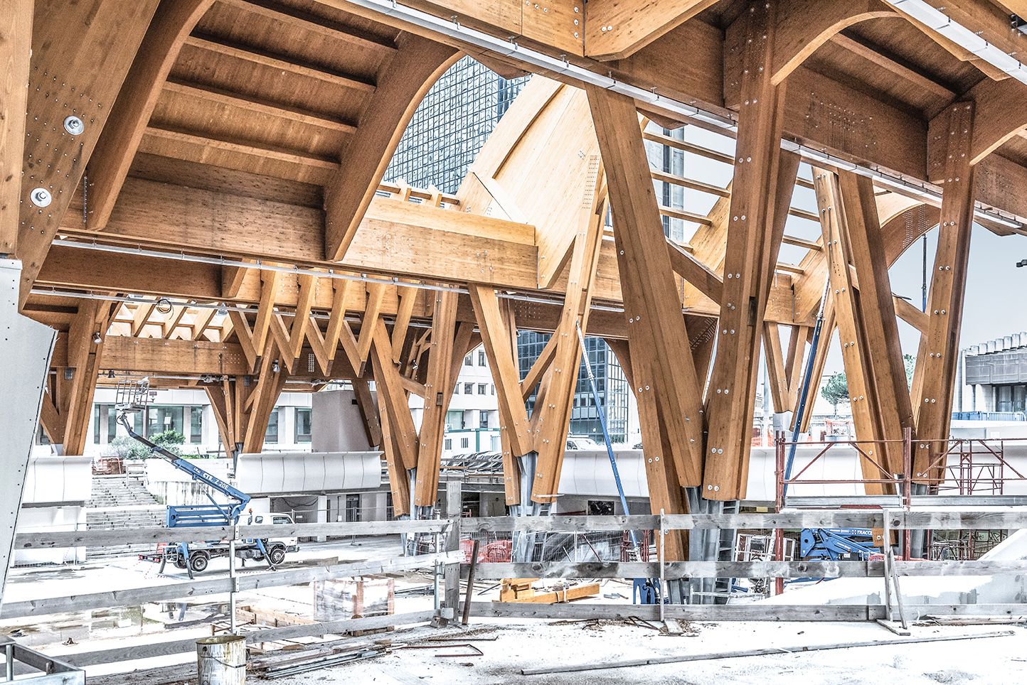 Wood is a very light material that blends perfectly with the pre-existing structures: we used the concrete structures and columns and inserted new wooden columns into them. The steel part of the concrete matches to make the base of the new columns, and then the rest of the column is entirely made of wood.