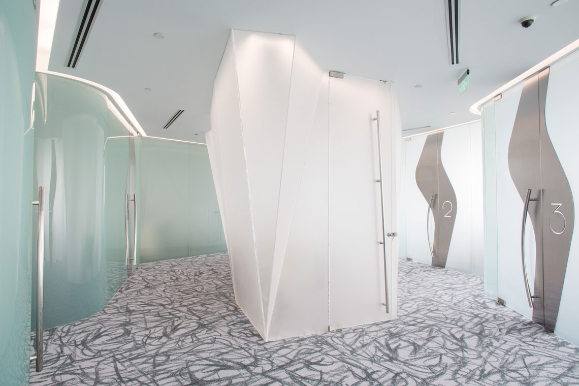 As the space was very limited, we proposed a scheme with a radial distribution of the 10 rooms around the central thermal room, with fluid circulation spaces and integrated furniture. Special attention was given to the public area, with exclusive furniture pieces designed especially for the Clinic: the reception desk based on the double helix of the DNA, bespoke display cases in the waiting area for different certificates, medals and collection objects, etc. The lighting scheme also recalls the curves of DNA’s structure and it is inspired by the study of DNA by the artist Jer Thorp (“Giant Tangle”). The thermal room is an irregular glass capsule with the minimum space necessary for the regenerating treatments. The distribution and design of the Center create a unique space but comfortable atmosphere. The curved layouts and walls increase the depth of the space, simultaneously allowing for a dynamic flow through it and a sense of comfort through a relatable size, giving the user a unique innovative experience, both through experiencing the design and the function of the Center.