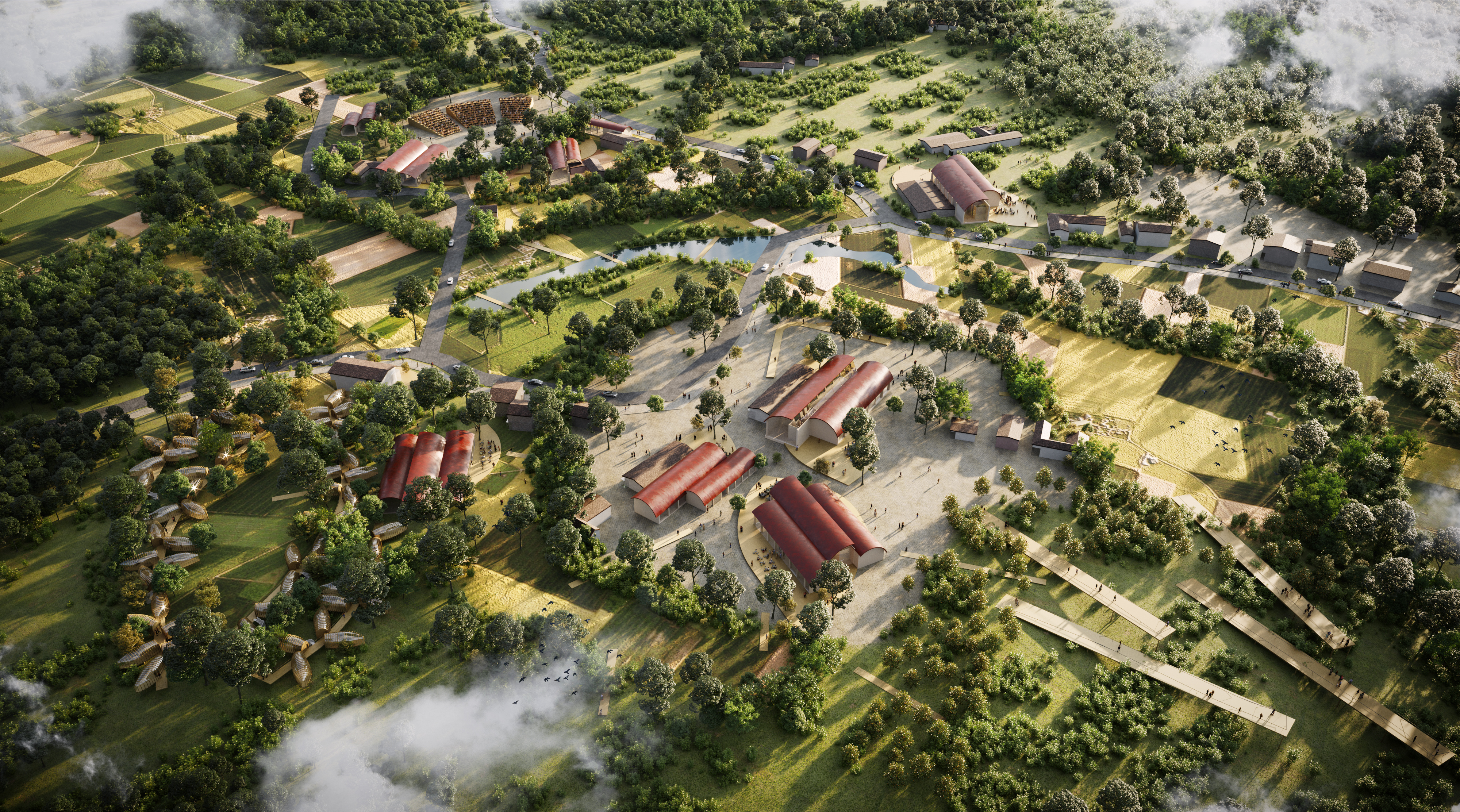 The Yuewan village Linpan will be the iconic space of Sichuan. It will tell us the history about Taoism, about the three kingdoms, Sichuan opera and about the nature and the Pandas. It will become a touristic icon to visit and to experience a special variety of touristic attractions. The landscape is defined by soft slopes with an organic stripe pattern that gives a sequence between fields and forest. We complete the waving shapes and form two main squares which are the cores for the new functions. These cores create spaces of density and voids that offers a sequence of open and intimate spaces. We introduce a building typology that will give a unique character to the Village. Inspired in the flying globes as a metaphor to the airport, we shape round roofs that specify the public and touristic buildings.