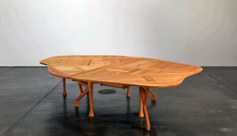 The Ines-table was designed by Enric Miralles for the collective exhibition Le Magazine in Grenoble, France, in 1993. Commissioned as a piece to represent his work and stimulate discussion among participants, Miralles conceived a table that would serve not as a topic, but as a medium of dialogue-”not talked about, but talked on.” The table is described as an “invisible piece,” emerging from a conceptual doubt, and is capable of adopting multiple configurations. Its foldable design transforms it into a mutable landscape, shifting form and function throughout the day.