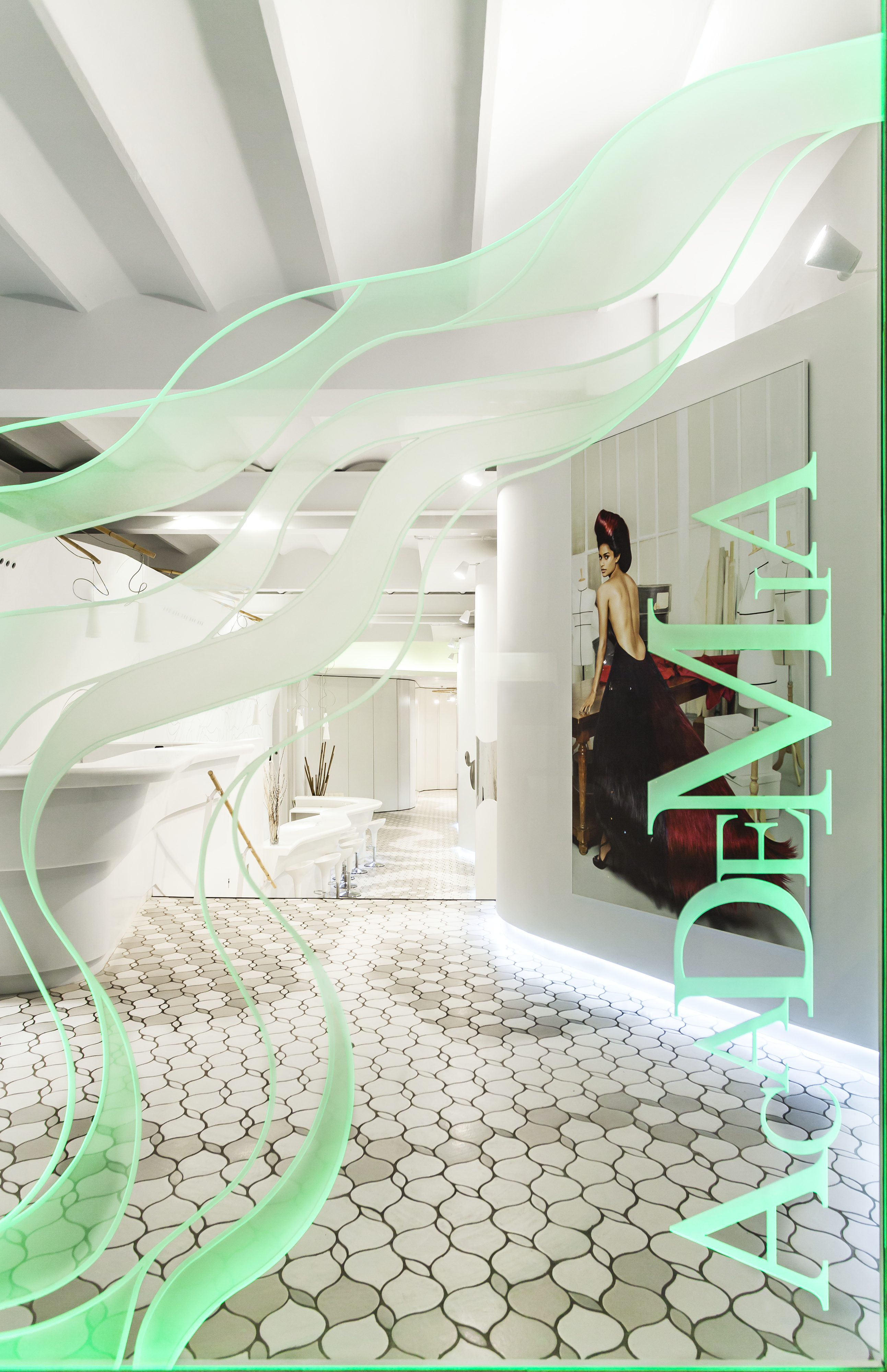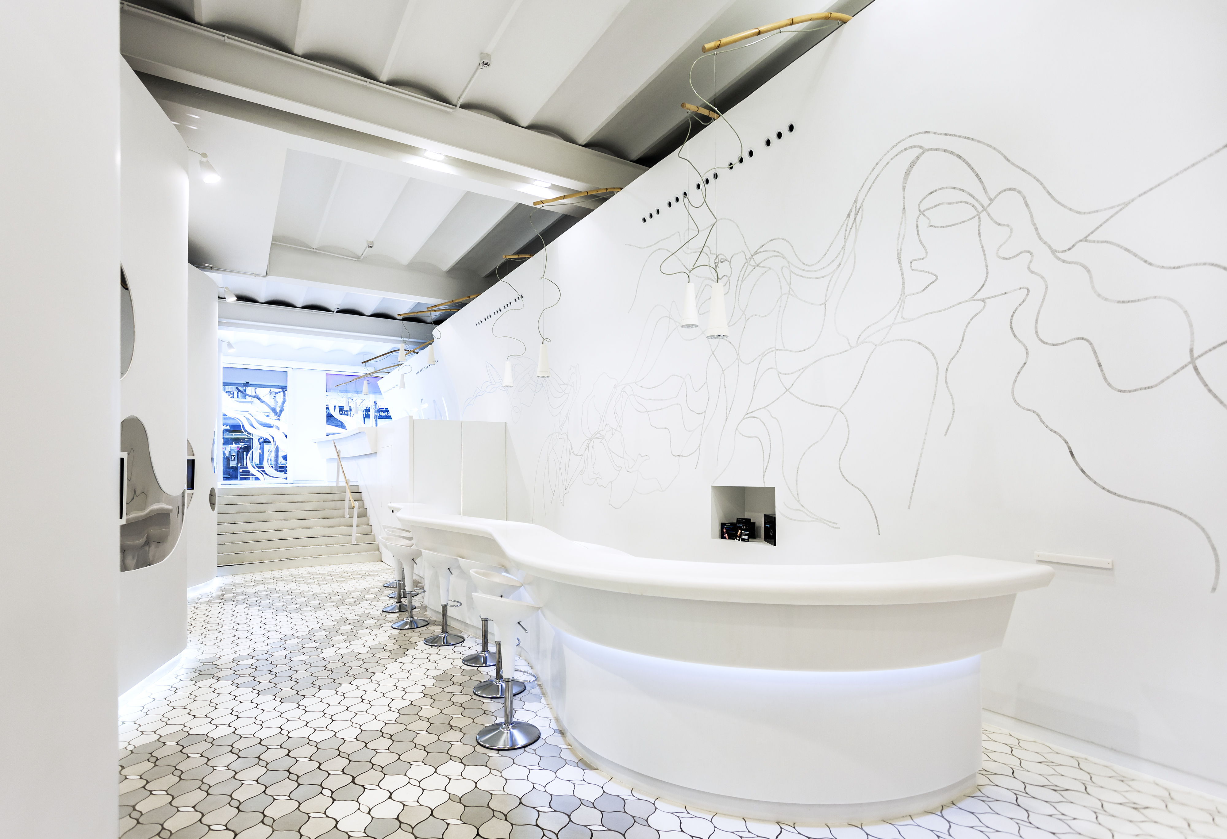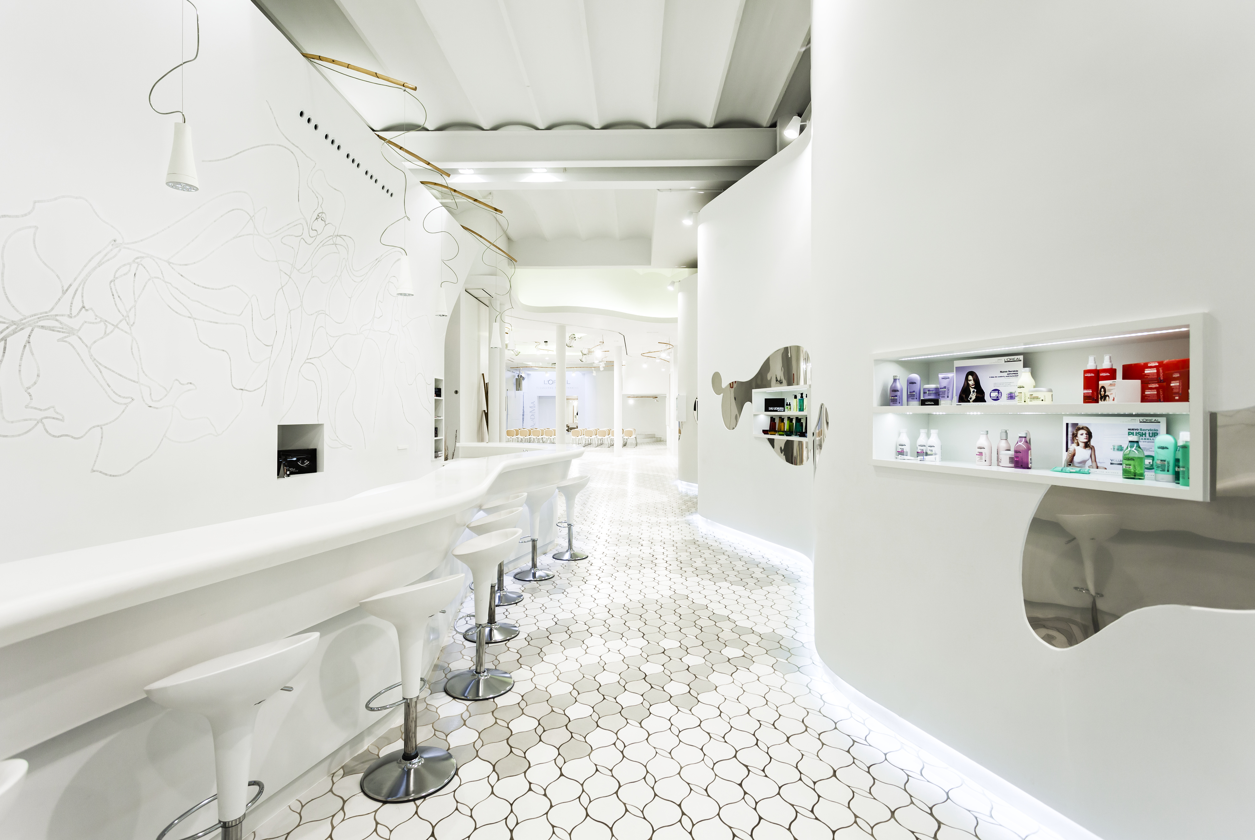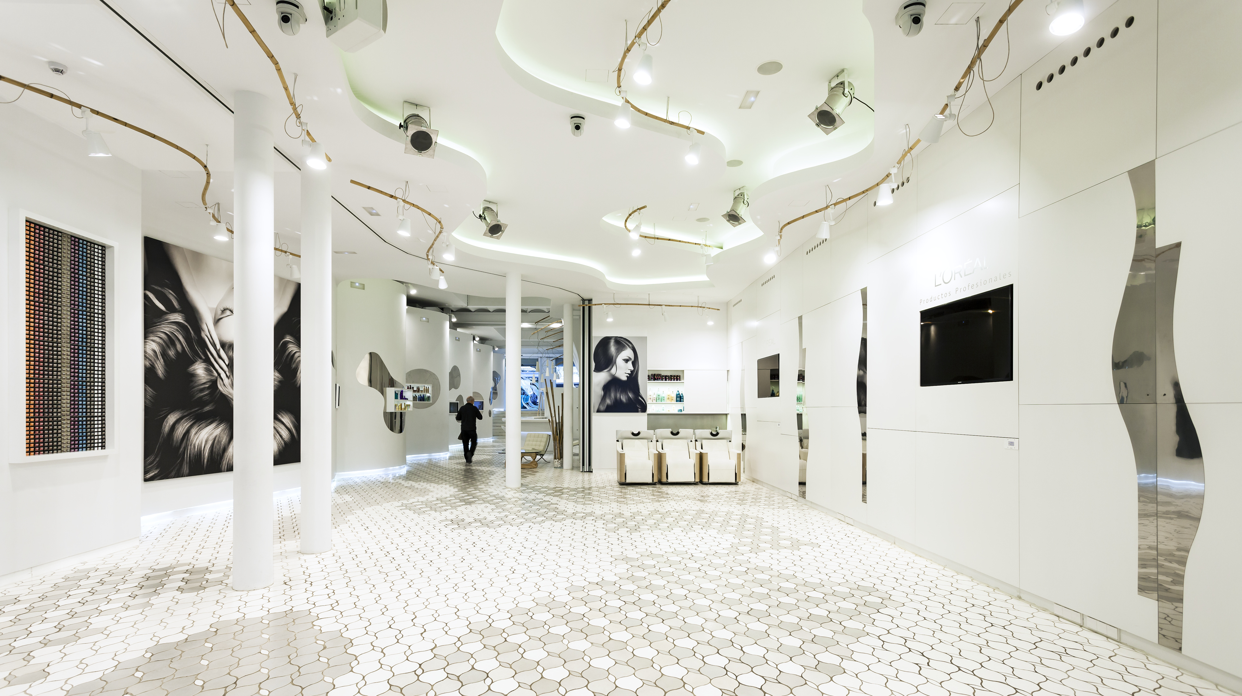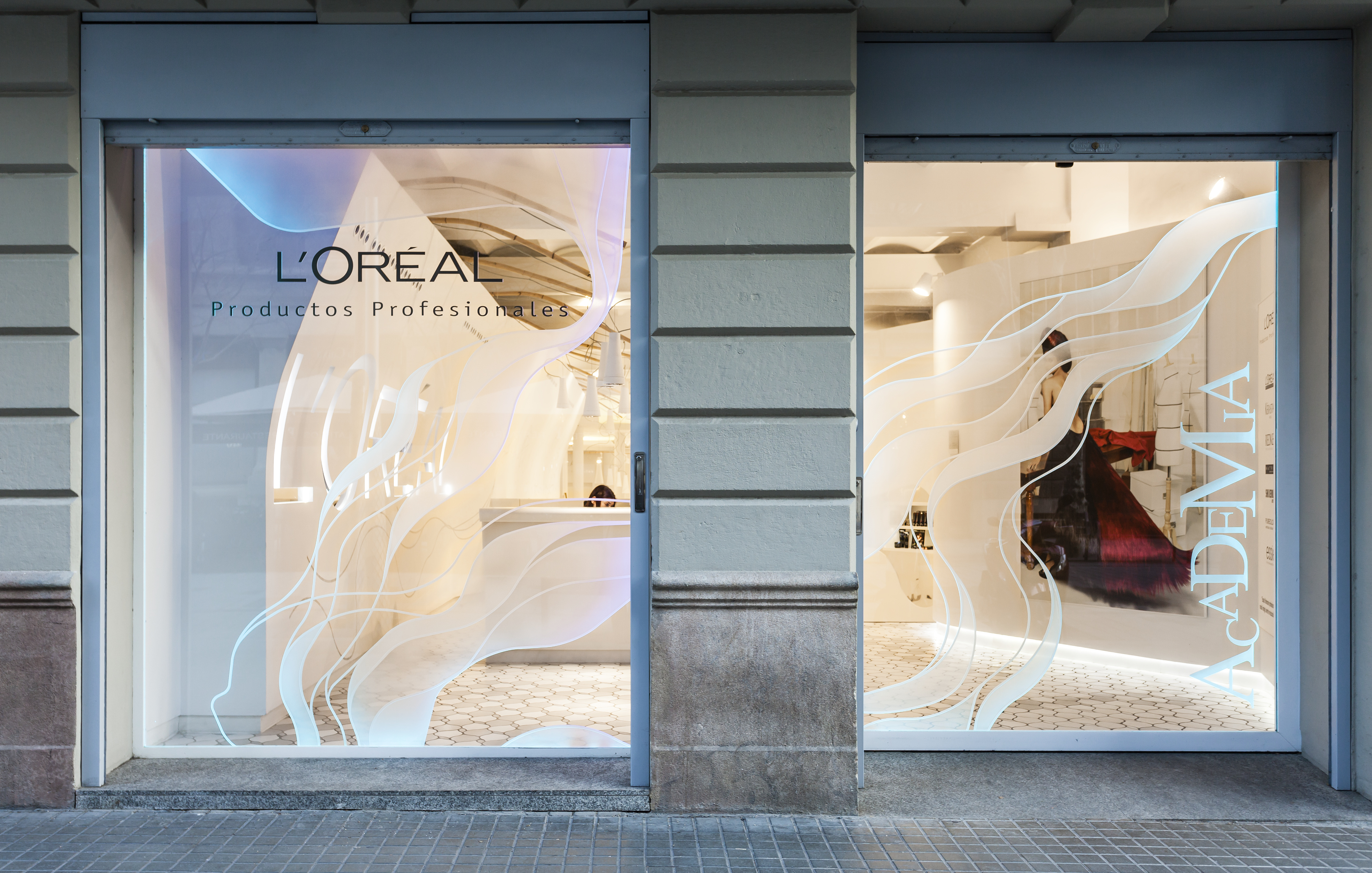 The new L’Oréal Academy is located on Corsega Street in Barcelona, between Paseo de Gracia and Avenida Diagonal. The concept centers around the idea of overall beauty, drawing inspiration from hair itself. The 1,100 m² space is distributed between two floors: the ground level accommodates public programs and training rooms, while the upper floor includes offices and skincare facilities.