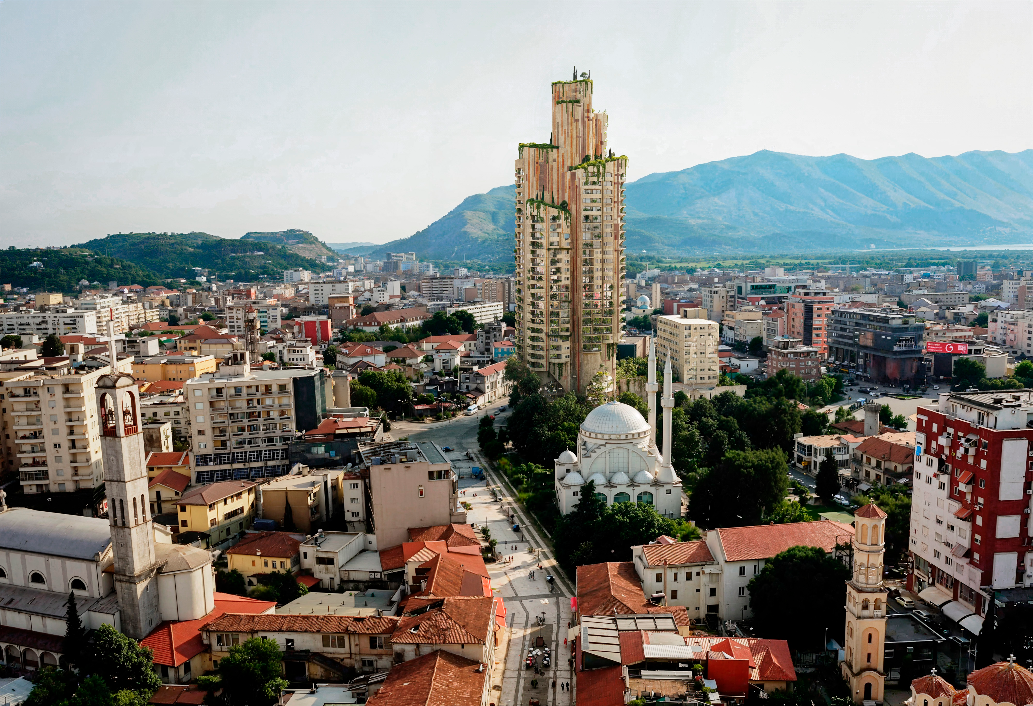 The ground floor fosters community engagement, featuring retail spaces, cafes, and cultural exhibitions that celebrate Shkodra’s artistic legacy. The upper floors house hotel accommodations and apart-hotels, ensuring luxurious experiences with breathtaking panoramic views of the city and surrounding mountains. The rooftop hosts a restaurant and lounge bar, offering a vibrant social space.