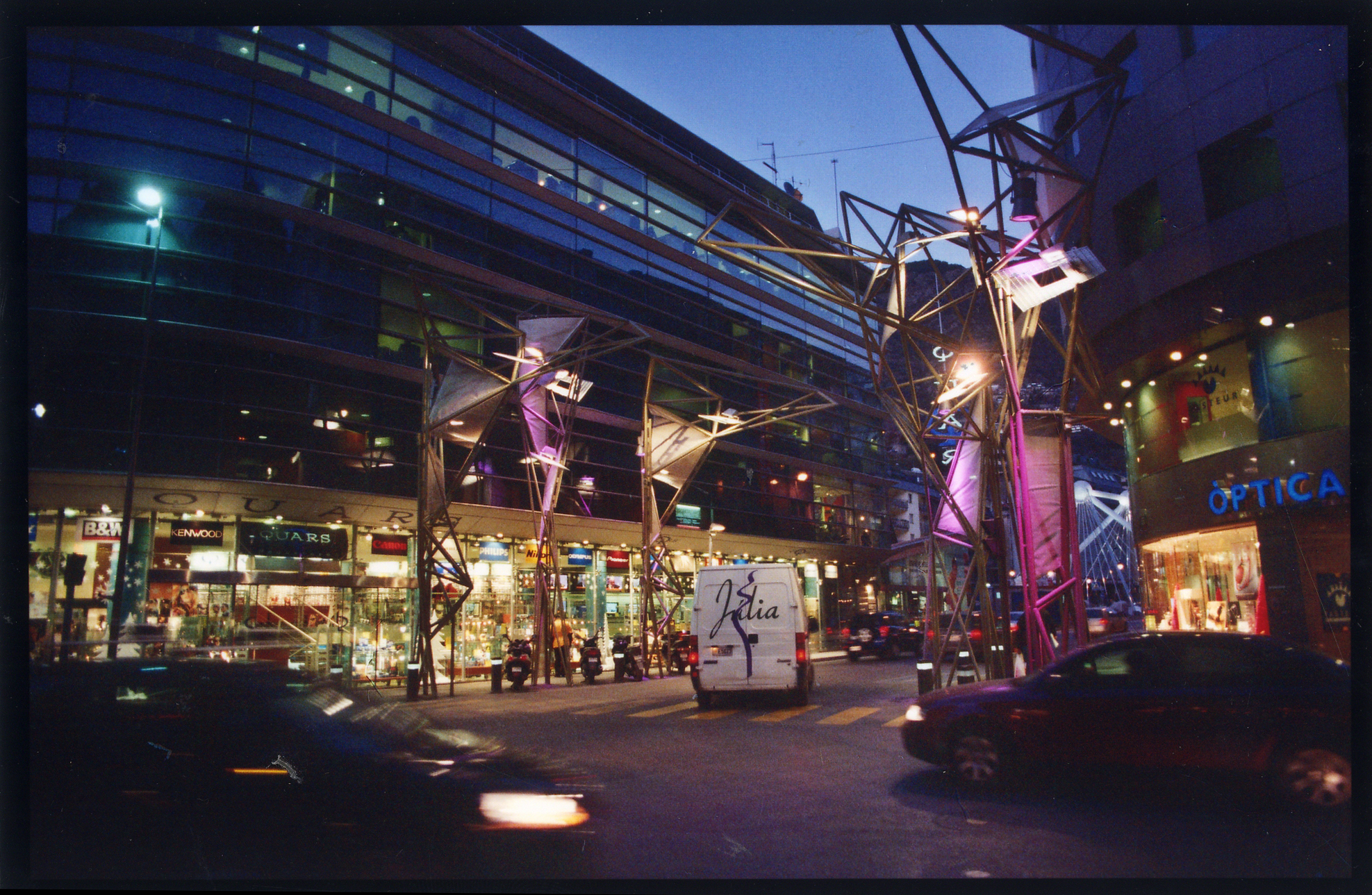 A core feature of the project is the integration of custom-designed urban furniture and distinctive steel canopy structures resembling abstract trees. These metal elements not only support commercial signage and lighting but also contribute to a renewed identity for the street. The paving patterns were inspired by natural flow, referencing both vehicular movement and the river that crosses the city. This abstract motif reinforces the idea of Avinguda Meritxell as a continuous urban landscape rather than a segmented street.